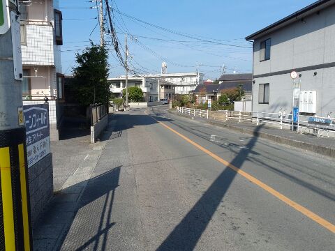 右手のバス停(開住宅入り口)のグレーのアパートの斜め裏側(少し下がった所)が店舗になります。